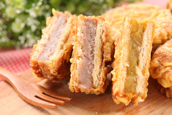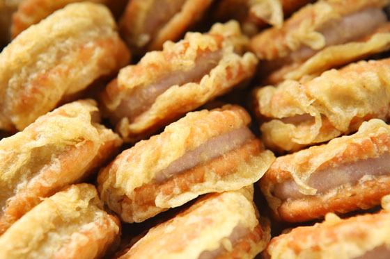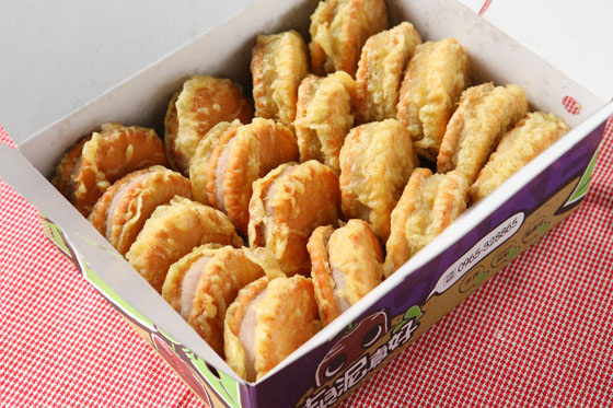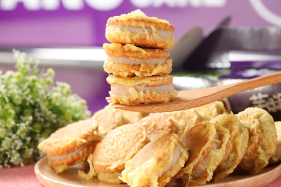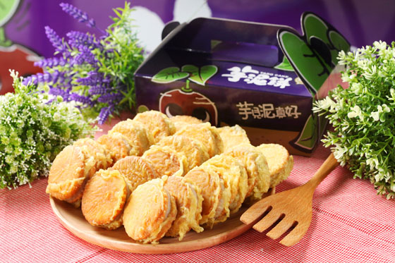 嚴選大甲芋頭、產地直送。使用新鮮的芋頭手工製作成芋泥餡料,夾入餅乾中油炸,咬下時餅乾酥酥脆脆,內餡紮實飽滿,濃郁的芋泥香氣撲鼻而來,讓人百嚐不膩!